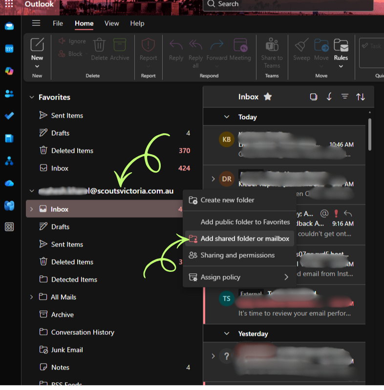Image: The role-based mailbox is now visible underneath the personal Scouts Victoria mailbox.